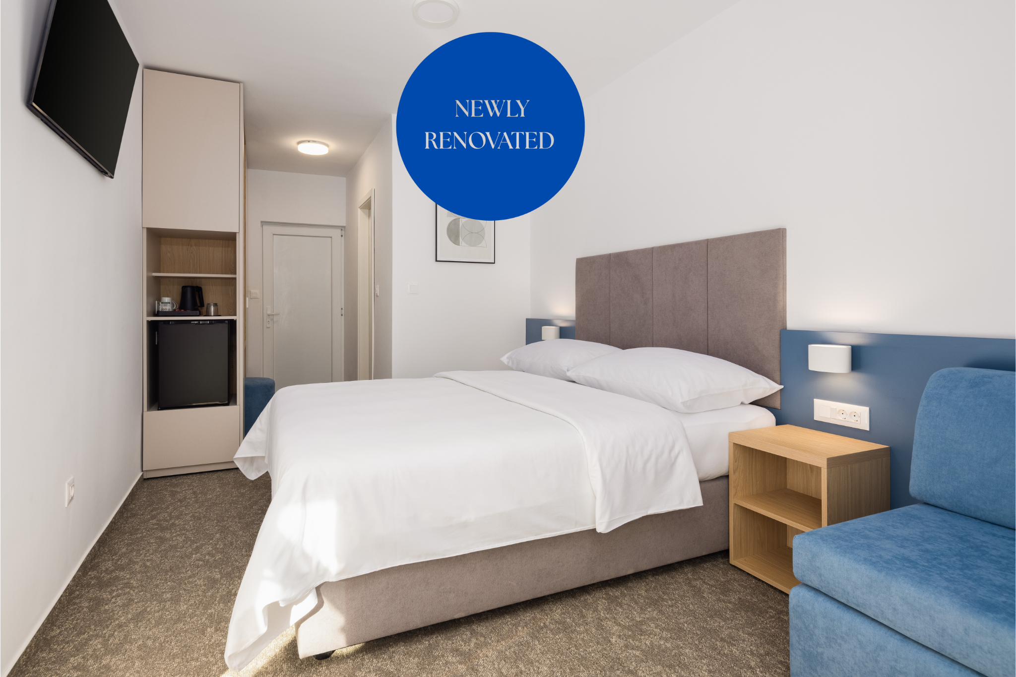 The Standard double room with an extra bed and balcony, annex, sea side offers comfortable accommodation for a relaxing stay, ideal for 1 to 3 adults or a combination of adults and children (up to 2 children, with a maximum age of 15). The renovated interior provides a pleasant and welcoming atmosphere, while the double bed and the extra bed in the form of a small pull-out sofa offer additional flexibility for a small family or a third guest. The sea-side balcony provides an inviting outdoor space, and the proximity to the sea adds extra value for complete relaxation.